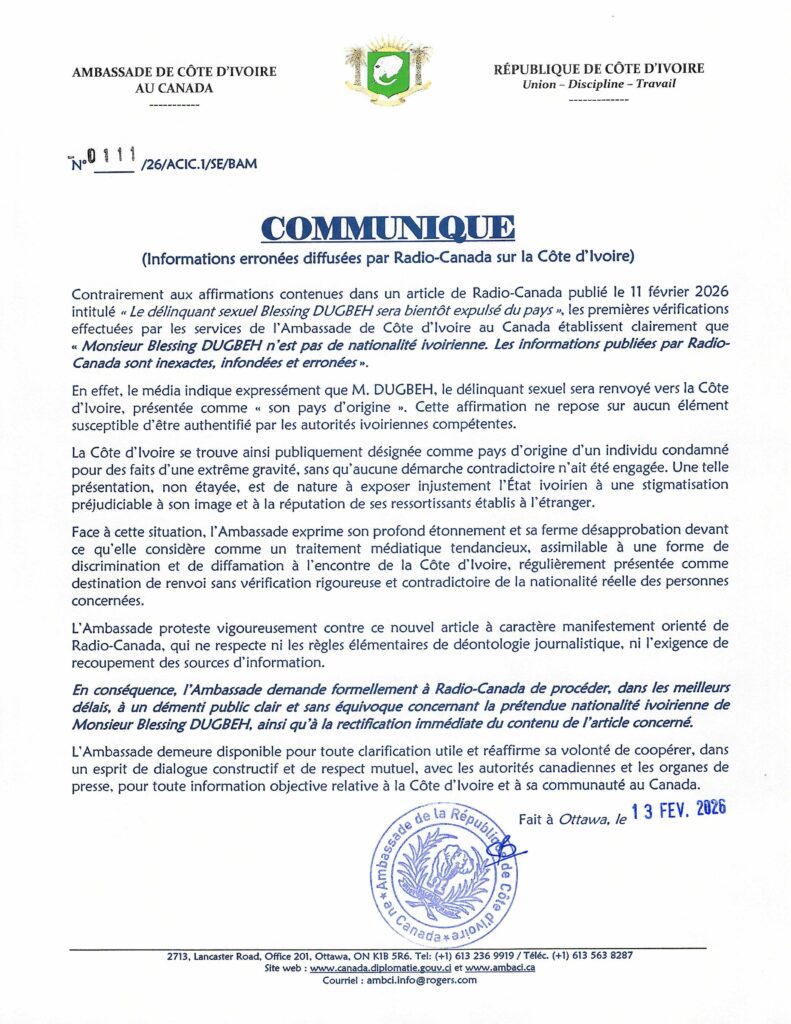 Communiqué : Fausses Informations de Radio-Canada sur la Côte d’Ivoire