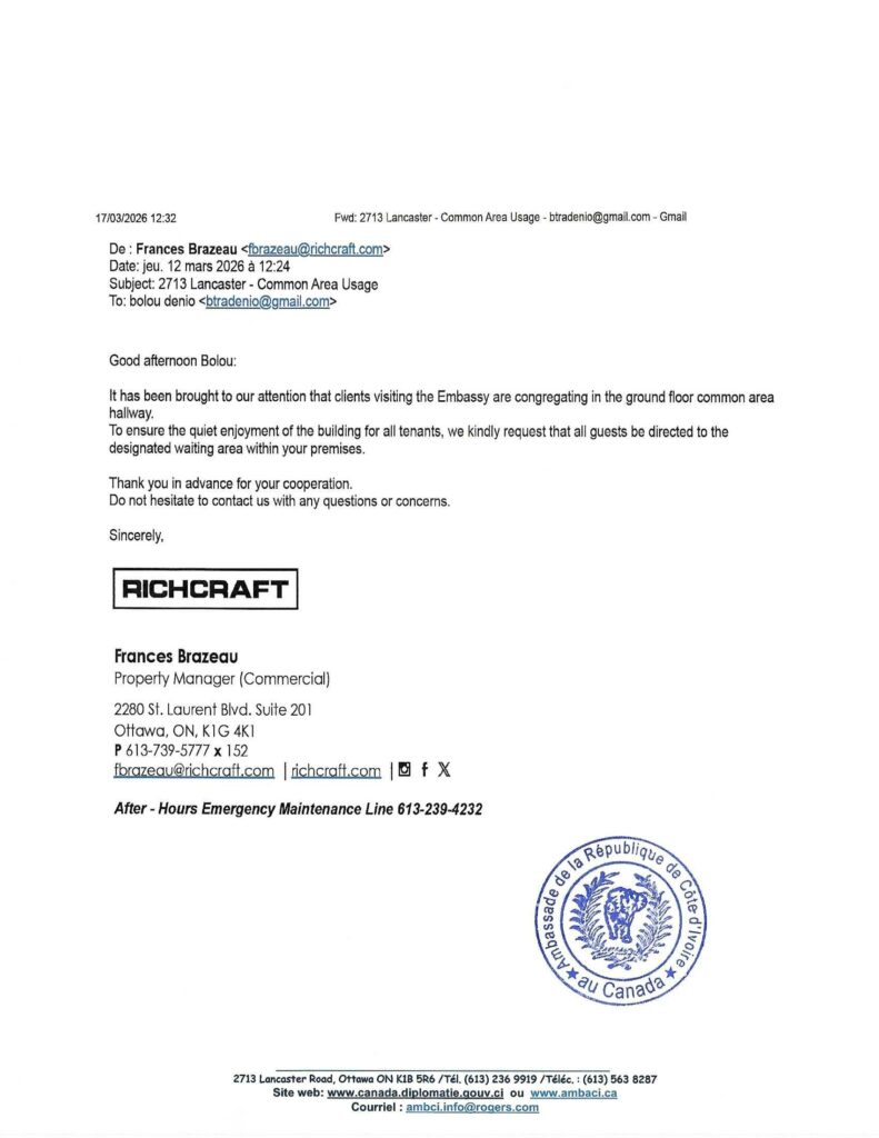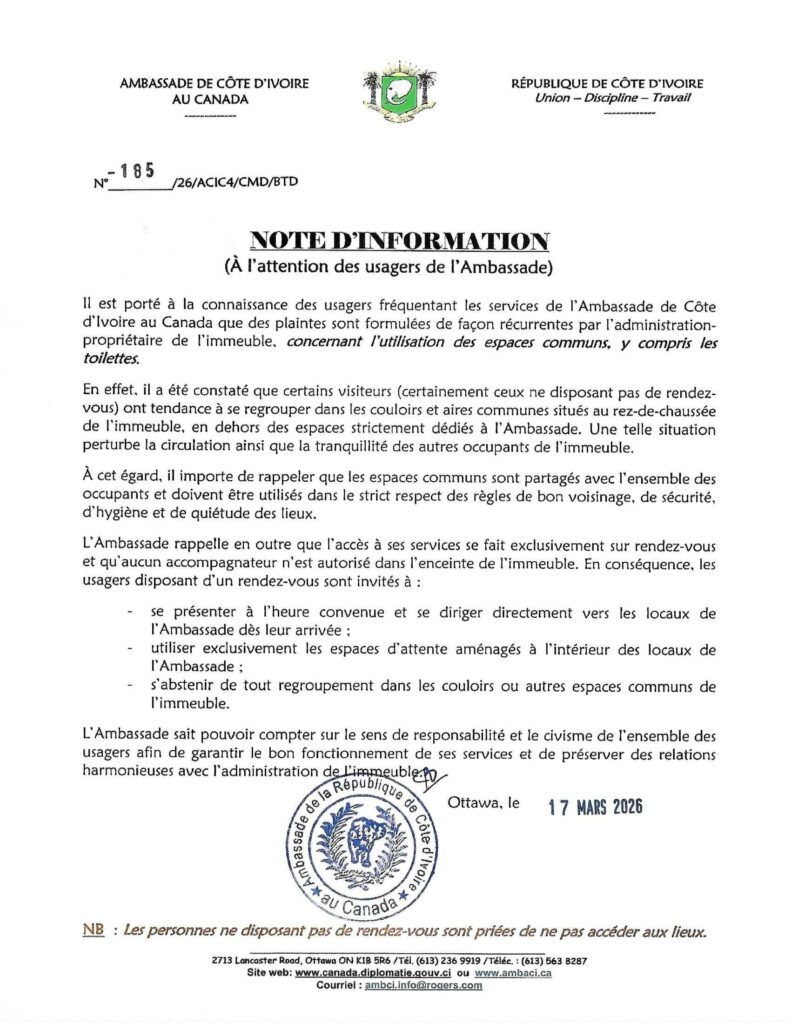 Les bureaux de l’Ambassade sont fermés les jeudis et les jours fériés du Canada et/ou de Côte d’Ivoire