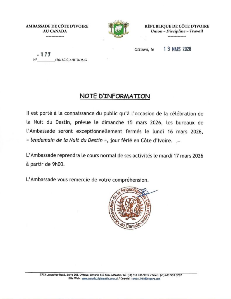 Les bureaux de l’Ambassade sont fermés les jeudis et les jours fériés du Canada et/ou de Côte d’Ivoire
