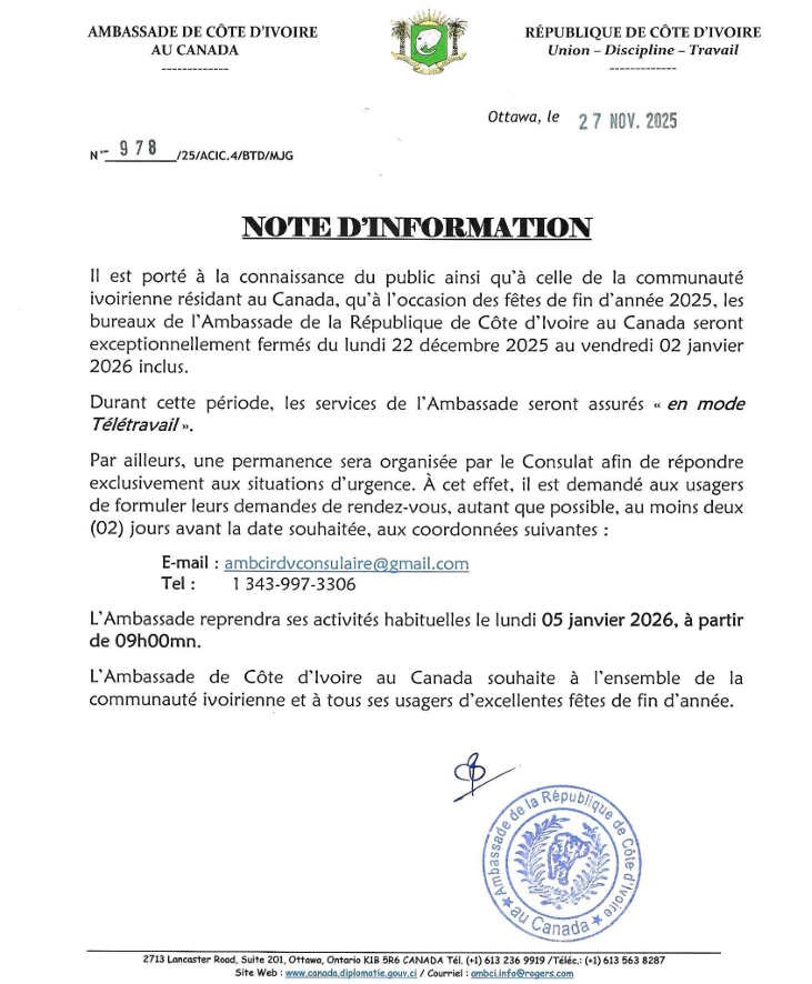 Les bureaux de l’Ambassade sont fermés les jeudis et les jours fériés du Canada et/ou de Côte d’Ivoire
